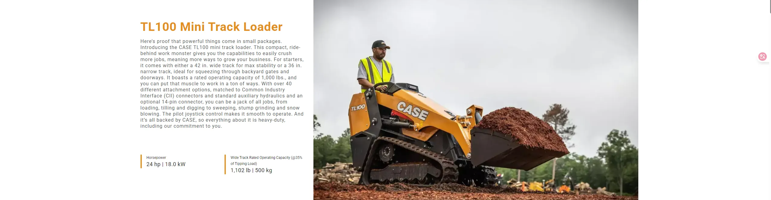 | Case | TL100 | 1,102 lbs | 24.7 HP | 13.0 GPM | Price on Request | Versatile with 40+ attachments, compact for tight spaces, radial lift geometry |