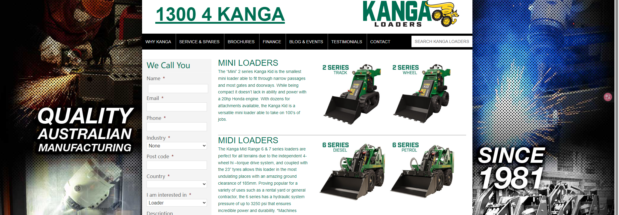 - Company Background: Kanga Loaders is 100% Australian-owned and manufactured, established in 1981 on the Gold Coast, Queensland. Kanga built the world’s first commercially produced stand-on compact skid steer loader, making it the true pioneer of this entire category. Winner of 1989 Australian Design Award, 2004 Premier of Queensland’s Export Awards, and 2014 GC Mayors Innovation Award.