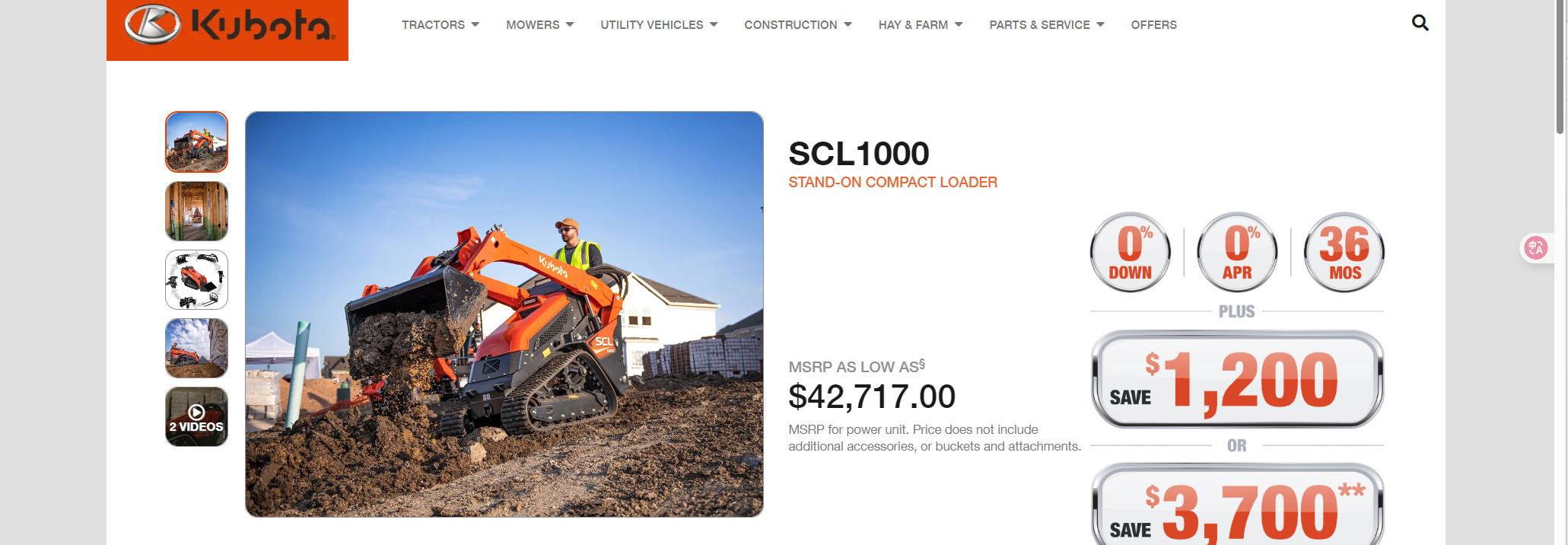 | Kubota | SCL1000 | 1,000 lbs | 24.8 HP | 15 GPM | $40k – $45k | Engine reliability, low center of gravity design |